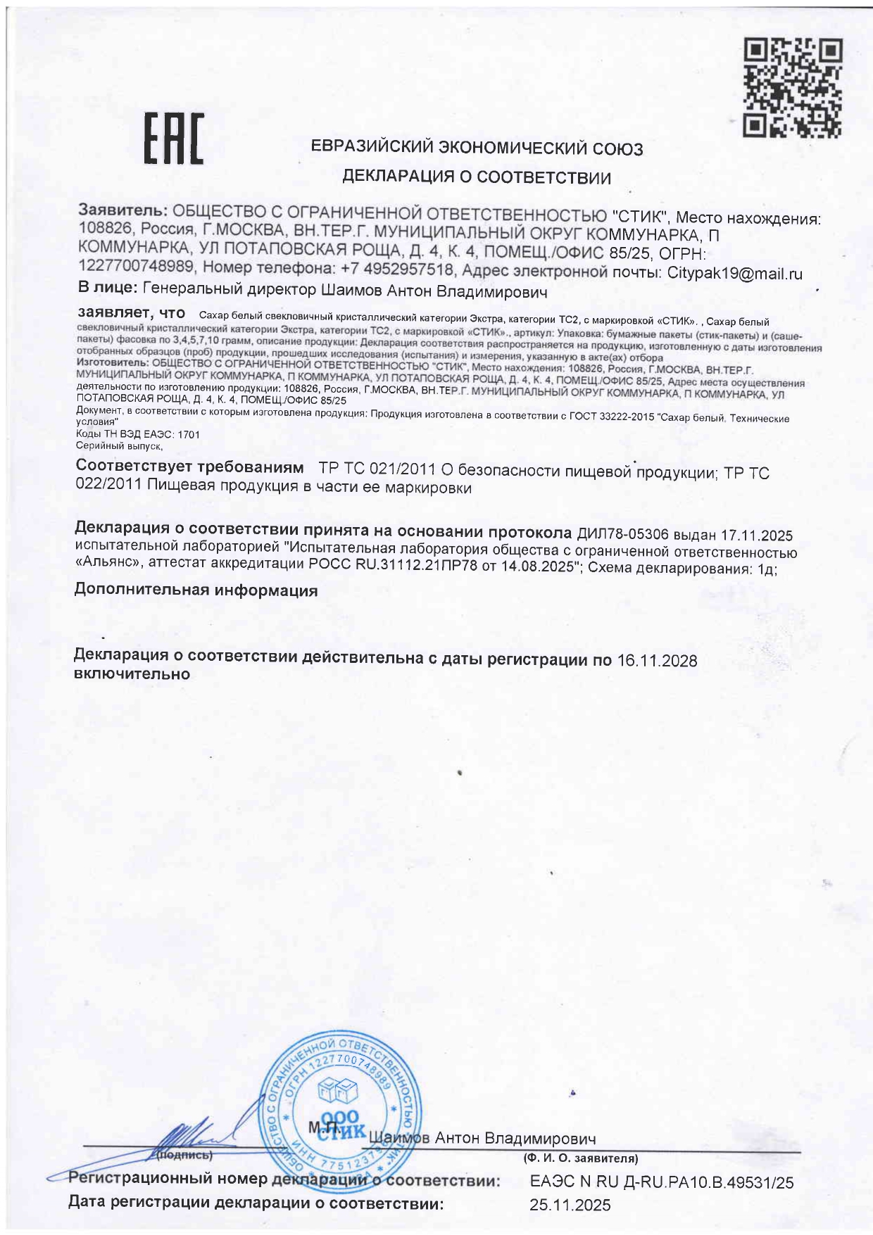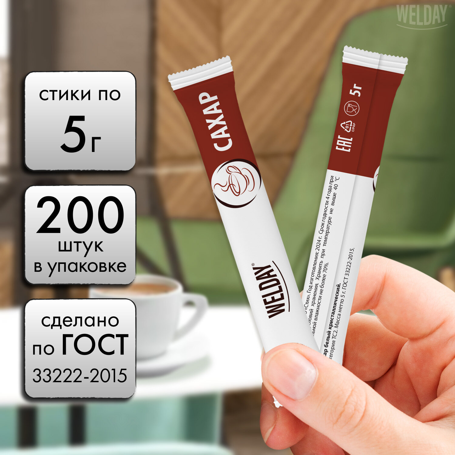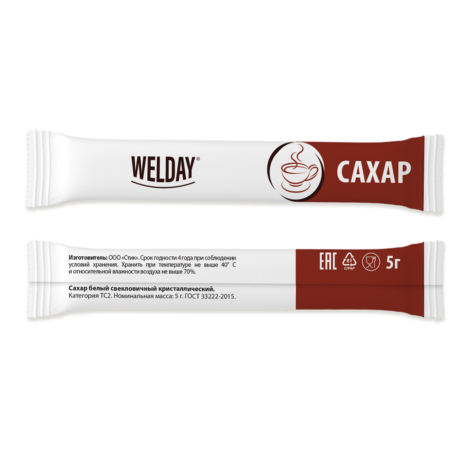 Сахар порционный WELDAY (ВЭЛДЭЙ) в стиках по 5 г, 200 штук Код товара: 622496 198,9 ₽ Купить Производитель:WELDAY Сахар в стиках WELDAY. Порционная упаковка в трехшовные пакетики-стики по 5 грамм обеспечивает удобство применения. В одной упаковке 200 стиков общим весом 1 кг. Произведен по ГОСТ 33222-2015. Порционный сахар в стиках WELDAY производится на современном оборудовании из сахара-песка высокого качества. Натуральный порционный сахар в стиках используется в офисах во время кофе-брейков, в шоурумах компаний, а также в заведениях общепита, в том числе тех, которые предлагают блюда навынос. Срок годности составляет 48 месяцев. Сахар предназначен для добавления в чай, какао, кофе и другие употребляемые в горячем виде напитки.Производство: РоссияТип продукта: сахарВес нетто: 1000 гВид продукта: натуральныйФорма: стикСоответствует требованиям ГОСТа: ГОСТ 33222-2015Тип упаковки: картонная коробкаСрок хранения: 48 мес.Фирма-производитель: WELDAYСрок годности: 48 месВес: 1,14 кгРазмер упаковки: 8.4 × 19.1 × 19.3 смОбъём: 0.0035 м3Промежуточная упаковка: 6 штТранспортная упаковка: 6 штШтрих-код: 4606224381114 Файлы Сертификат-1.jpg Сертификат-2.jpg Сертификат-3.jpg