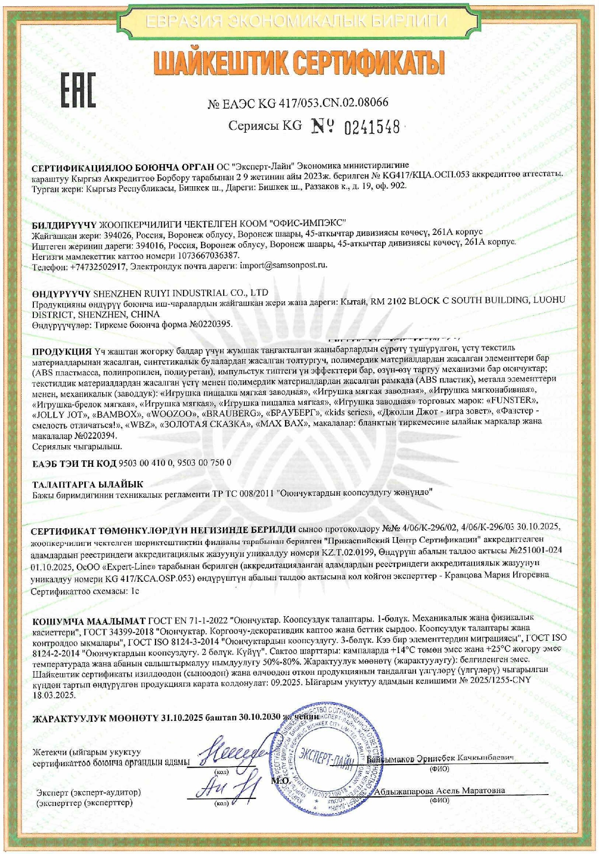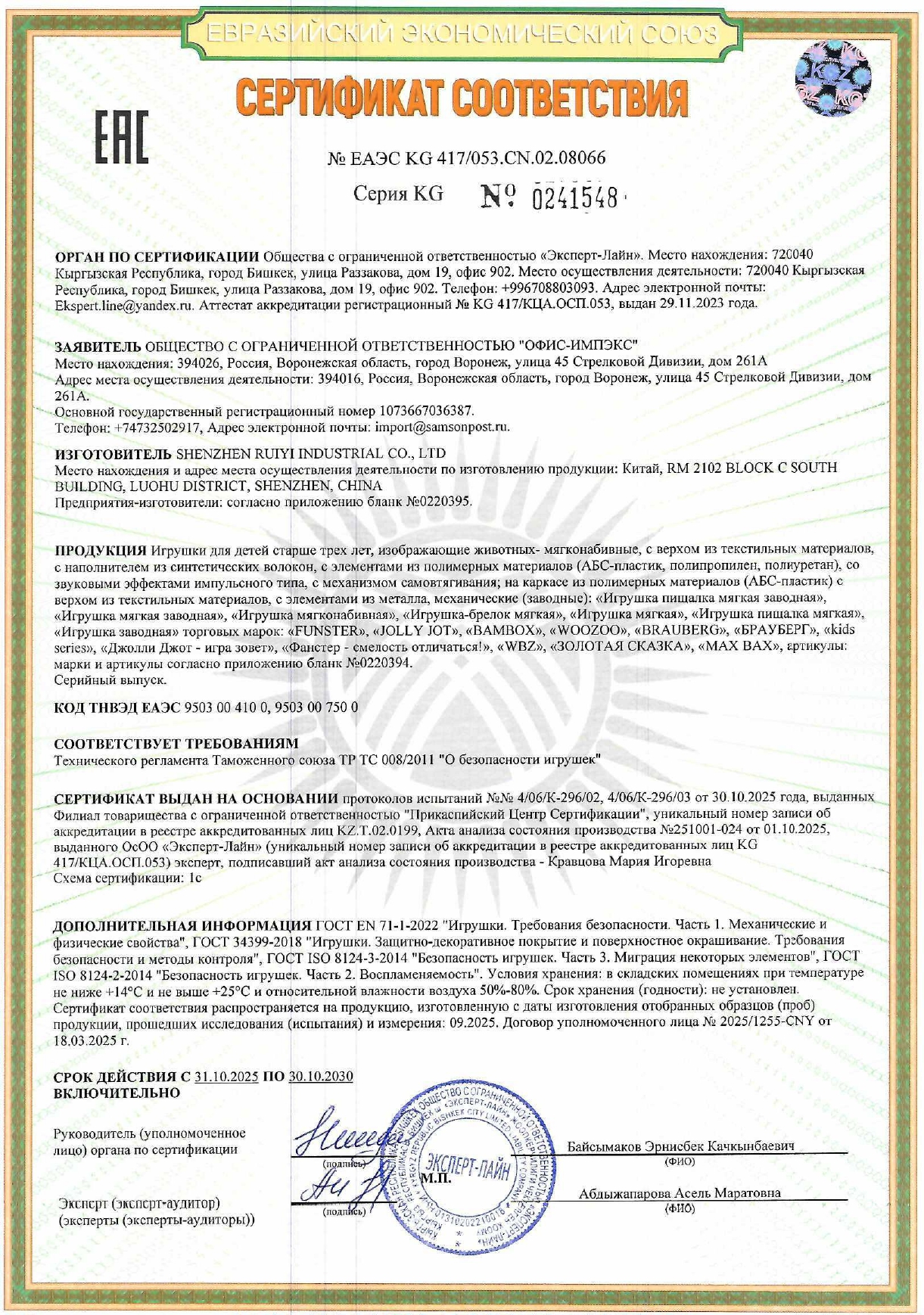 Игрушка пищалка мягкая заводная "Кот Пухляш", высота 8 см, WOOZOO (ВУЗУ) Код товара: 666201 310,55 ₽ Купить Производитель:WOOZOO Милейшая игрушка-пищалка – мягкий Кот Пухляш от WOOZOO! Такой мягкий плюшевый Кот Пухляш развеселит и взрослого, и ребенка, поднимет настроение. Кот Пухляш пищит и крутит хвостом с вибрацией. Высота – 8 см. Кому подойдёт эта игрушка? • детям от?3?лет – для первых игр с заводными механизмами; • школьникам – как милый аксессуар для рабочего места; • подросткам – в качестве необычного талисмана; • взрослым – для коллекционирования или снятия стресса; • любителям животных – как очаровательная альтернатива настоящему питомцу; • поклонникам необычных и милых сувениров.Производство: КитайТип игрушки: игрушка заводнаяВозраст ребенка от: 3 летПол: универсальныйОсобенности: пищит и крутит хвостом с вибрациейЦвет: розовыйДизайн: Кот ПухляшМатериал игрушки: полиэстерНаполнитель: полипропиленовое волокноВысота: 8 смШирина: 8 смГлубина: 9 смУпаковка: -Вес: 66 грРазмер упаковки: 5.8 × 8.5 × 6.1 смОбъём: 0.0009 м3Промежуточная упаковка: 12 штТранспортная упаковка: 144 штШтрих-код: 4606224499963 Файлы Сертификат-1.jpg Сертификат-2.jpg Сертификат-3.jpg Сертификат-4.jpg Сертификат-5.jpg Сертификат-6.jpg Сертификат-7.jpg Сертификат-8.jpg
