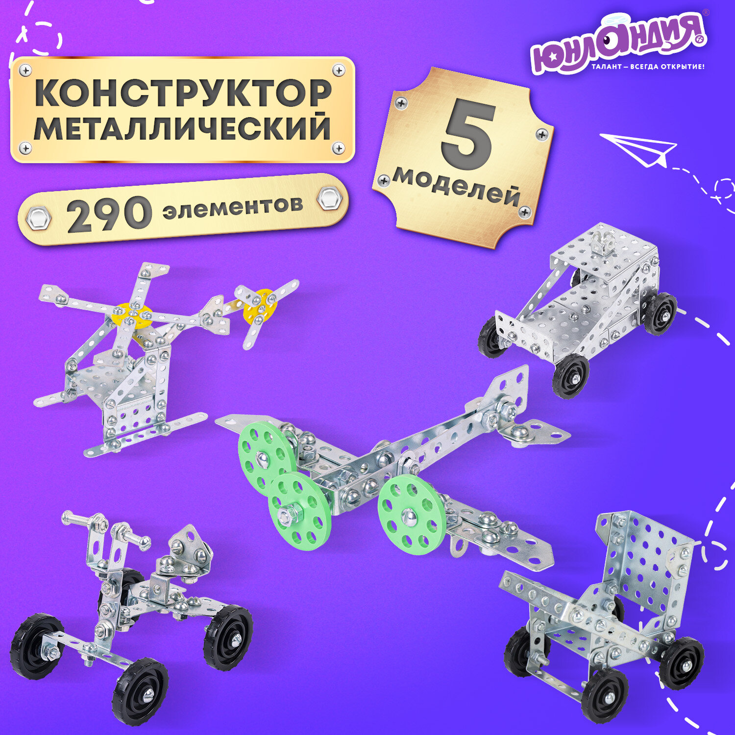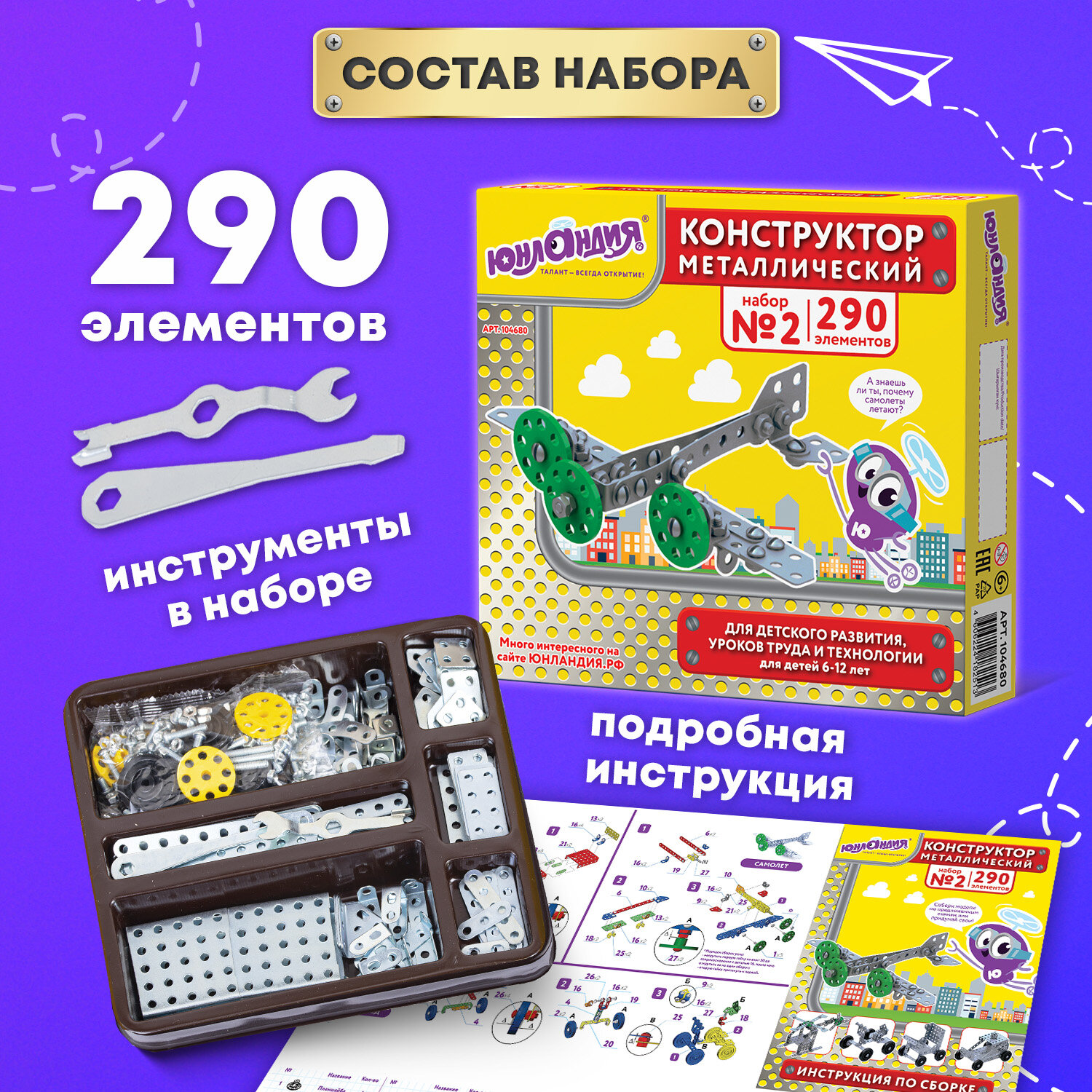Конструктор металлический ЮНЛАНДИЯ "Для уроков труда №2", развивающий, 290 элементов Код товара: 104680 895,13 ₽ Купить Производитель:ЮНЛАНДИЯ Неистощим интерес детей к познанию мира! Конструктор металлический ЮНЛАНДИЯ "Для уроков труда №2" способствует развитию мышления, мелкой моторики, речи, фантазии младших школьников. Набор используется и на уроках труда в начальной школе. В картонной коробке упакованы металлические и пластмассовые детали, включая подвижные, крепления, ключи – всего 290 элементов, что предоставляет богатые возможности для конструирования. Комплектация: детали – 288 шт., ключ гаечный – 1 шт., отвертка – 1 шт., инструкция по сборке. Есть подробная инструкция с описанием 5 моделей. С помощью отдельных деталей ребенок сначала под руководством взрослого, а позже и самостоятельно будет создавать модели самолета, велосипеда, вертолета, машины и коляски. Набор предназначен для детей от 6 лет, уровень сложности – начальный. Цвет всех деталей – светло-серый, материал соответствует всем требованиям ГОСТа.Производство: РоссияТип товара: конструкторСерия: Для уроков трудаМатериал: металл, пластикНаличие подвижных деталей: даУровень сложности сборки: начальныйРекомендуемый возраст: от 6 летТип деталей: разные формыСюжет: транспортКоличество элементов: 290 шт.Количество моделей для сборки: 5Комплектация: инструкция по сборкеЦвет: ассортиУпаковка: картонная коробкаВес: 719 грРазмер упаковки: 3.9 × 23.3 × 20.6 смОбъём: 0.0024 м3Промежуточная упаковка: 10 штТранспортная упаковка: 10 штШтрих-код: 4606224182513 Сертификат-1.jpg Сертификат-2.jpg Сертификат-3.jpg