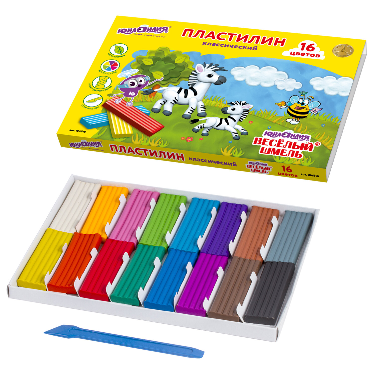 Масса набора - 240 г. Со стеком. В набор входят 16 брусков по 15г разных цветов: белый, оранжевый, розовый, салатовый, голубой, сливовый, коричневый, серый, желтый, красный, малиновый, зеленый, синий, фиолетовый, черный, темно-коричневый. Пластилин ЮНЛАНДИЯ высшего качества имеет прекрасную пластичность, мягкость. Легко принимает нужную форму, не оставляет цветных следов на руках. Не токсичен, безопасен для детей. Способствует развитию цветового зрения и пространственного мышления.