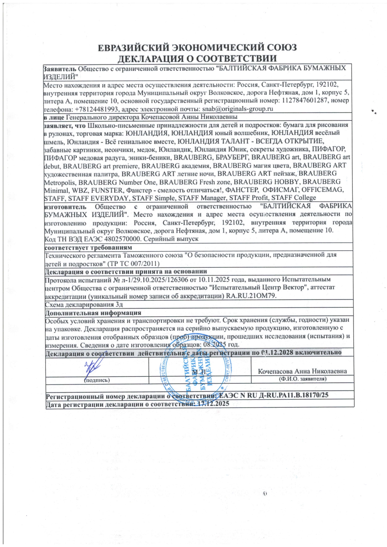Бумага для рисования в рулоне ЮНЛАНДИЯ "РИСУЙ-ИГРАЙ-УЧИСЬ", 420 мм х 20 м, плотность 100 г/м2 Код товара: 112173 325,27 ₽ Купить Производитель:ЮНЛАНДИЯ Бумага для рисование в рулоне ЮНЛАНДИЯ "РИСУЙ-ИГРАЙ-УЧИСЬ" предназначена для детского творчества. Подходит для рисования акварелью, гуашью, цветными карандашами и фломастерами, восковыми мелками. Новый формат бумаги для рисования "в рулоне", позволит использовать её на столе, мольберте, полу и даже на стене. Внутренний диаметр отверстия 26 мм подходит для крепления на специальных мольбертах и подставках для рисования. Рулон бумаги плотностью 100 г/м2 имеет ширину 42 см и длину 20 метров.Производство: РоссияШирина рулона: 420 ммДлина рулона: 20 мПлотность: 100 г/м2Внутренний диаметр рулона: 26 ммВес: 781 грРазмер упаковки: 6 × 42.4 × 6 смОбъём: 0.0024 м3Промежуточная упаковка: 12 штТранспортная упаковка: 12 штШтрих-код: 4606224286907 Сертификат-1.jpg Сертификат-2.jpg Сертификат-3.jpg