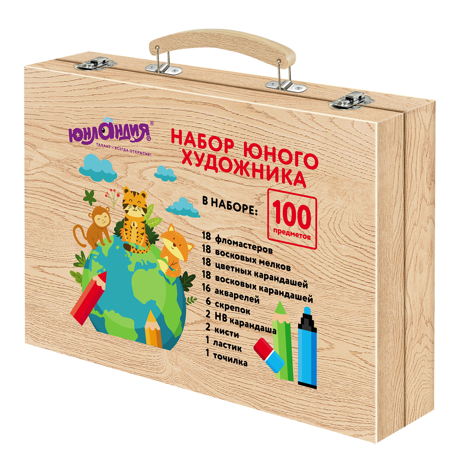Набор ЮНОГО ХУДОЖНИКА "ANIMALS" для рисования и творчества в кейсе ЮНЛАНДИЯ, 100 предметов Код товара: 665675 996,26 ₽ Купить Производитель:ЮНЛАНДИЯ Набор юного художника ЮНЛАНДИЯ отлично подойдет для первых шагов в рисовании. В красочном кейсе есть все самые необходимые предметы для развития творческих способностей ребенка. Набор хорошо развивает усидчивость, воображение, образное мышление. Набор представляет собой кейс с красочным дизайном и грамотно подобранным наполнением из 100 предметов. Кейс раскладывается как книга. Каждый предмет надежно закреплен в ячейке. Надежный корпус кейса гарантирует полную защиту внутреннего наполнения от повреждений. Набор надежно упакован в термоусадку и короб из гофрокартона. Углы кейса дополнительно защищены от повреждений при транспортировке. Набор удобно брать с собой в школу или в поездку. В набор входят: высококачественные цветные карандаши – 18 цветов; яркие восковые мелки – 18 цветов; восковые карандаши - 18 цветов; удобные фломастеры – 18 цветов; насыщенные акварельные краски – 16 цветов; скрепки - 6 штук; чернографитный карандаш – 2 штуки; кисть из синтетики – 2 штуки; ластик – 1 штука; точилка – 1 штука; деревянный раскладывающийся кейс с красочным дизайном и пластиковыми подложками.Производство: КитайНазначение: для рисования и творчестваКоличество в комплекте предметов: 100 шт.Цвет кейса: светлое деревоУпаковка: короб из гофрокартонаСрок годности: 60 месВес: 840 грРазмер упаковки: 4.5 × 20.5 × 28 смОбъём: 0.0064 м3Промежуточная упаковка: 20 штТранспортная упаковка: 20 штШтрих-код: 4606224448244