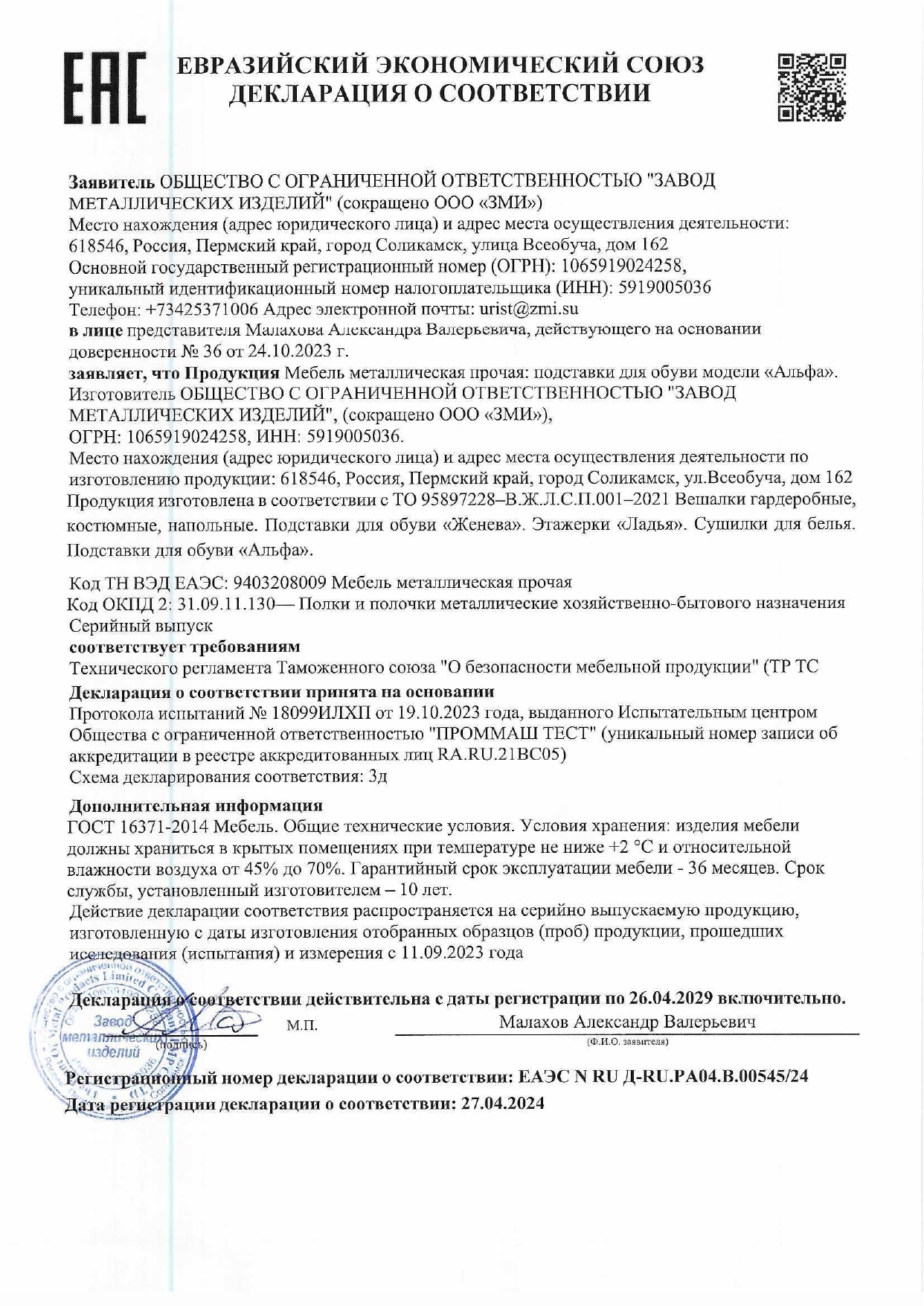 Банкетка для обуви "Альфа-13СЯ", 450х300х480 мм, 2 полки, ящик, металл/кожзам, черный/коричневый Код товара: 700920 2 101,95 ₽ Купить Производитель:ZMI Компактная банкетка "Альфа" с ящиком идеально впишется в интерьер дома или офиса. Удобное мягкое сиденье-бокс обеспечит комфорт при обувании и хранении аксессуаров, поддерживая порядок во входной зоне. Функционально и стильно! Каркас выполнен из стальной трубы диаметром 16 мм с полимерным покрытием. Две полки для обуви вмещают до 4 пар, нагрузка на полку – до 8 кг. Расстояние между полками – 215 мм, между полкой и сиденьем –135 мм. Откидное мягкое сиденье-ящик выдерживает нагрузку до 120 кг. В ящике возможно хранить аксессуары для обуви и другие мелочи. Дополнительный пластиковый декоративный крючок для обувной ложки. На ножках установлены заглушки, защищающие пол от повреждений. Изделие поставляется в разобранном виде в картонной коробке с ручкой. Простая сборка согласно инструкции, ключи для сборки в комплекте.Производство: РоссияТип товара: банкеткаКоличество полок для обуви: 2Мягкое сиденье: даЦвет: черный/коричневыйМатериал обивки сиденья: кожзамМатериал каркаса: металлСерия: АльфаМатериал полок: стальНагрузка на полку с обувью: 8 кгСоответствует требованиям ГОСТа: ГОСТ 19917-2014Высота: 480 ммШирина: 450 ммГлубина: 300 ммТип поставки: в разобранном видеВес: 4,27 кгРазмер упаковки: 13.8 × 56.4 × 32.9 смОбъём: 0.0256 м3Промежуточная упаковка: 1 штТранспортная упаковка: 1 штШтрих-код: 4610093788349 Файлы Приложение-1.png Сертификат-1.jpg Сертификат-2.jpg Сертификат-3.jpg