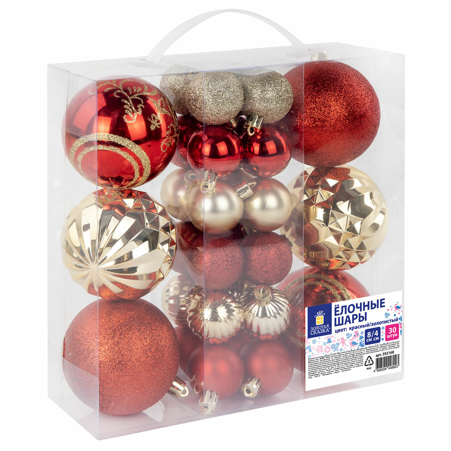 Шары ёлочные НАБОР 30 шт., 8 см/4 см, "Red&Gold", пластик, красные/золото, ЗОЛОТАЯ СКАЗКА Ликвидация Код товара: 592168 503,77 ₽ Купить Производитель:ЗОЛОТАЯ СКАЗКА Ёлочные шары ЗОЛОТАЯ СКАЗКА - непременный атрибут Нового года. Они будут отлично смотреться как на зеленой, так и на белой хвое ели. Насыщенные цвета в сочетании с отделкой разной фактуры создадут атмосферу праздника и волшебства. В наборе: 2 шара красного цвета с золотыми узорами с глянцевым эффектом (диаметром 8 см), 2 шара золотого цвета с глянцевым эффектом (диаметром 8 см), 2 шара красного цвета с эффектом "глиттер" (диаметром 8 см), 4 шара золотого цвета с эффектом "глиттер" (диаметром 4 см), 4 шара красного цвета с глянцевым эффектом (диаметром 4 см), 4 шара красного цвета с эффектом "глиттер" (диаметром 4 см), 4 шара золотого цвета с глянцевым эффектом (диаметром 4 см), 4 шара красного цвета с матовым эффектом (диаметром 4 см), 4 шара золотого цвета с матовым эффектом (диаметром 4 см), а также 30 нитей из полиэстера золотистого цвета длиной 30 см для подвешивания шаров. Шары имеют петлю для подвешивания в верхней части. Их можно использовать для украшения новогодней ели или в качестве новогоднего сувенира. Весь комплект упакован в прозрачный ПВХ-короб с секциями. В верхней части короба есть ручка из ПВХ. Набор дополнительно упакован в индивидуальный трехслойный гофрокороб.Производство: КитайТип украшения: набор украшений для елиКоличество в наборе: 30 шт.Материал: пластикЦвет: красный/золотойВес: 387 грРазмер упаковки: 9.4 × 24.5 × 24.9 смОбъём: 0.0066 м3Промежуточная упаковка: 16 штТранспортная упаковка: 16 штШтрих-код: 4606224448923 Файлы Сертификат-1.jpg Сертификат-2.jpg Сертификат-3.jpg Сертификат-4.jpg Сертификат-5.jpg Сертификат-6.jpg Сертификат-7.jpg Сертификат-8.jpg Сертификат-9.jpg Сертификат-10.jpg Сертификат-11.jpg Сертификат-12.jpg Сертификат-13.jpg Сертификат-14.jpg Сертификат-15.jpg Сертификат-16.jpg Сертификат-17.jpg Сертификат-18.jpg Сертификат-19.jpg Сертификат-20.jpg Сертификат-21.jpg Сертификат-22.jpg Сертификат-23.jpg Сертификат-24.jpg Сертификат-25.jpg Сертификат-26.jpg