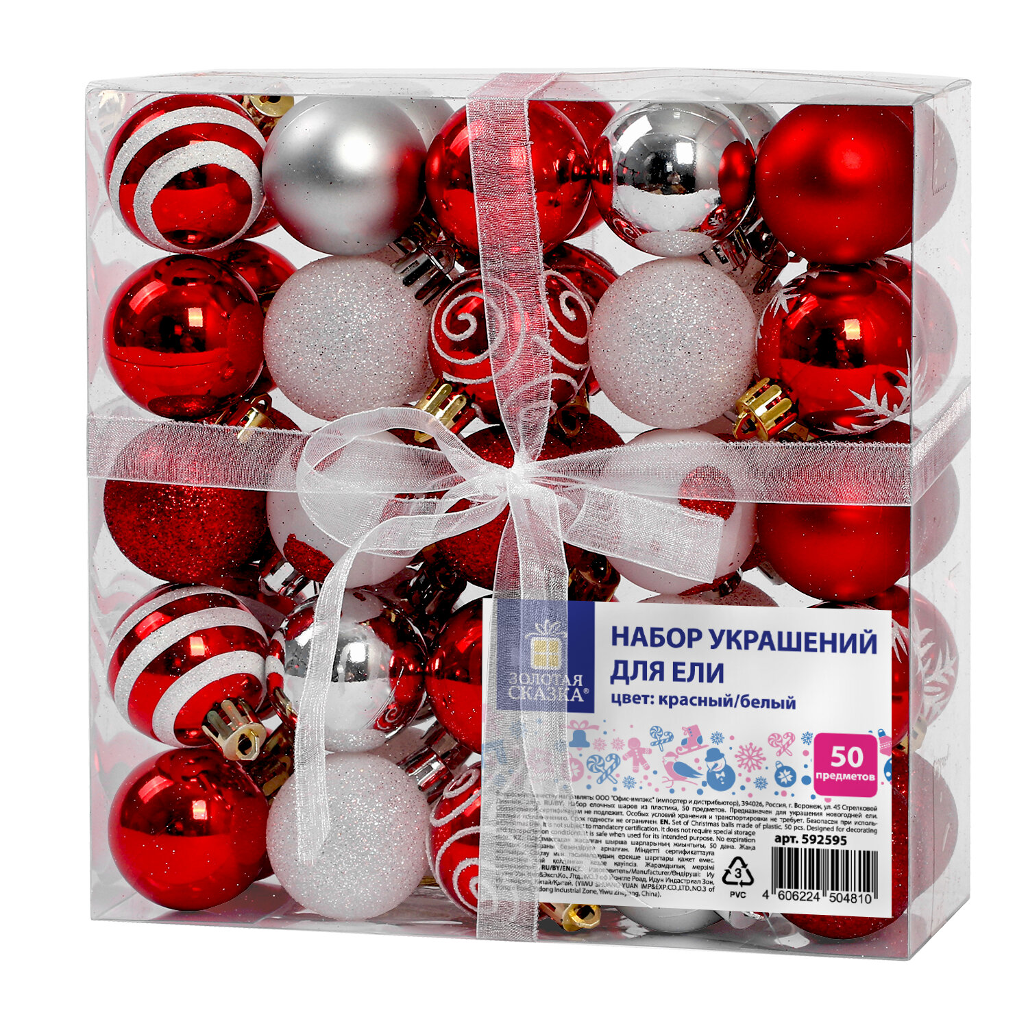 Шары елочные НАБОР 50 предметов "Red & Snow Winter", пластик, красный/белый, ЗОЛОТАЯ СКАЗКА Код товара: 592595 928,32 ₽ Купить Производитель:ЗОЛОТАЯ СКАЗКА Елочные шары – непременный атрибут Нового Года. Они будут отлично смотреться как на зеленой, так и на белой хвое ели. Насыщенные цвета в сочетании с отделкой разной фактуры создадут атмосферу праздника и волшебства. • В наборе: - 6 шаров красного цвета с эффектом глиттер (диаметром 4 см), - 12 шаров красного цвета с глянцевым эффектом и с рисунком (диаметром 4 см), - 8 шаров красного цвета с глянцевым эффектом (диаметром 4 см), - 4 шаров красного цвета с матовым эффектом (диаметром 4 см), - 8 шаров белого цвета с эффектом глиттер (диаметром 4 см), - 4 шара серебристого цвета с матовым эффектом (диаметром 4 см), - 4 шара серебристого цвета с глянцевым эффектом (диаметром 4 см), - 4 шара белого цвета с матовым эффектом и рисунком (диаметром 4 см). Набор упакован в ПВХ-бокс, дополнительно упакован в индивидуальный трехслойный гофрокороб.Производство: КитайТип украшения: набор украшений для елиКоличество в наборе: 50 шт.Материал: пластикЦвет: красный/белыйВес: 321 грРазмер упаковки: 8.3 × 20.2 × 20.5 смОбъём: 0.0046 м3Промежуточная упаковка: 10 штТранспортная упаковка: 10 штШтрих-код: 4606224504810 Файлы Сертификат-1.jpg Сертификат-2.jpg Сертификат-3.jpg Сертификат-4.jpg Сертификат-5.jpg Сертификат-6.jpg Сертификат-7.jpg Сертификат-8.jpg Сертификат-9.jpg Сертификат-10.jpg Сертификат-11.jpg Сертификат-12.jpg Сертификат-13.jpg Сертификат-14.jpg Сертификат-15.jpg Сертификат-16.jpg Сертификат-17.jpg Сертификат-18.jpg Сертификат-19.jpg Сертификат-20.jpg Сертификат-21.jpg Сертификат-22.jpg Сертификат-23.jpg Сертификат-24.jpg Сертификат-25.jpg Сертификат-26.jpg