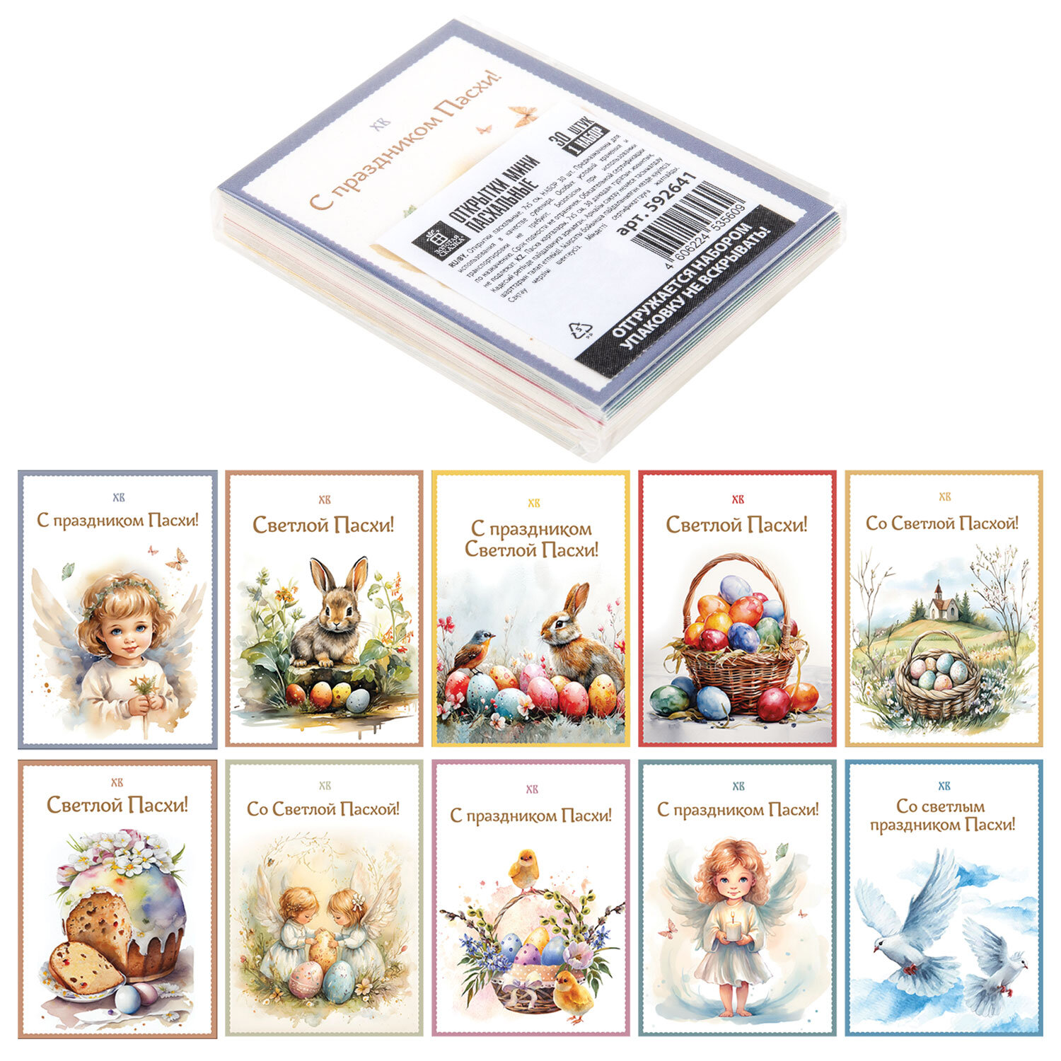 Открытки МИНИ пасхальные НАБОР 30 шт., 7х5 см, "Пасхальное чудо", картон, ЗОЛОТАЯ СКАЗКА Код товара: 592641 210,6 ₽ Купить Производитель:ЗОЛОТАЯ СКАЗКА Пасхальное настроение в каждой детали – с мини-открытками ЗОЛОТАЯ СКАЗКА, созданными, чтобы дарить тепло и улыбки! В наборе 30 открыток размером 7х5 см, изготовленных из плотного картона 250 г/м2 с глянцевой поверхностью. В наборе представлено 10 уникальных дизайнов: с пасхальными яйцами, цыплятами, кроликами, куличами, ангелочками, цветочными мотивами и нежными весенними узорами (по 3 штуки каждого дизайна). МИНИ формат идеален для того, чтобы положить в пакетик к куличу, прикрепить на упаковку, использовать как бирку или в качестве сувенира. А насыщенные краски и глянец придают открыткам праздничный блеск и делают их настоящим акцентом в любом оформлении.Производство: РоссияТип товара: открытка пасхальнаяРазмер: 7х5 смКоличество в комплекте: 30 шт.Дизайн: Пасхальное чудоУпаковка: пакетВес: 29 грРазмер упаковки: 1.3 × 7 × 4.9 смОбъём: 0.0001 м3Промежуточная упаковка: 160 штТранспортная упаковка: 160 штШтрих-код: 4606224535609 Файлы Сертификат-1.jpg Сертификат-2.jpg Сертификат-3.jpg Сертификат-4.jpg Сертификат-5.jpg Сертификат-6.jpg Сертификат-7.jpg Сертификат-8.jpg Сертификат-9.jpg Сертификат-10.jpg Сертификат-11.jpg Сертификат-12.jpg Сертификат-13.jpg Сертификат-14.jpg Сертификат-15.jpg Сертификат-16.jpg Сертификат-17.jpg Сертификат-18.jpg Сертификат-19.jpg Сертификат-20.jpg Сертификат-21.jpg Сертификат-22.jpg Сертификат-23.jpg Сертификат-24.jpg Сертификат-25.jpg Сертификат-26.jpg