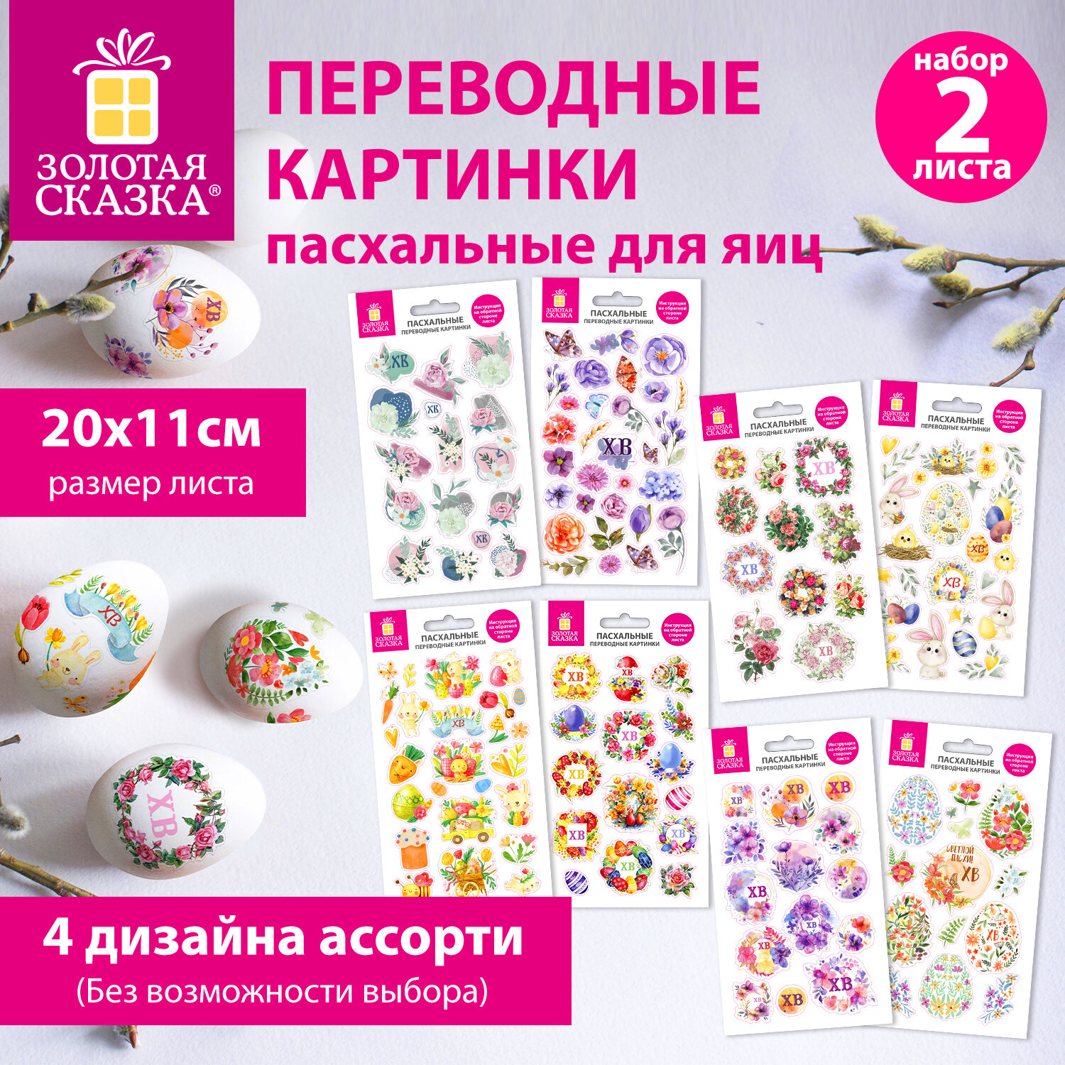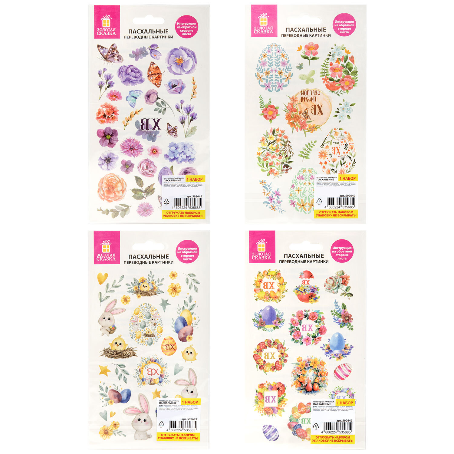 Переводные картинки для яиц, НАБОР 2 листа 20x11 см, "С Пасхой", ассорти, ЗОЛОТАЯ СКАЗКА Код товара: 592649 64,07 ₽ Купить Производитель:ЗОЛОТАЯ СКАЗКА Украсьте пасхальные яйца легко и красиво с набором переводных картинок "С Пасхой" ЗОЛОТАЯ СКАЗКА! В наборе – 2 листа форматом 20х11 см с разными дизайнами: яркие весенние мотивы, нежные цветы, забавные цыплята, кролики и пасхальные яички (4 набора ассорти с разными дизайнами, без возможности выбора). Каждый лист предлагает уникальный стиль, чтобы вы могли разнообразить оформление и создать настоящую праздничную коллекцию. Как использовать переводные картинки ЗОЛОТАЯ СКАЗКА: 1. Вырежьте любую понравившуюся вам картинку. 2. Отделите прозрачную защитную пленку. 3. Положите картинку лицом вниз на поверхность яйца. 4. Смочите ватный диск или салфетку водой и аккуратно, не сдвигая картинку с выбранного места, промокните сверху всю поверхность картинки. 5. Подождите 20–30 секунд, пока бумага полностью не пропитается водой. 6. Осторожно снимите бумажную основу, начиная с края. 7. Дайте яйцу высохнуть 1–2 минуты. Готово! Важно: на листе изображения и надписи отзеркалены – это особенность технологии. Как только картинка переносится на яйцо, текст и рисунки становятся правильными, читаемыми и выглядят безупречно! На обратной стороне каждого листа – понятная инструкция, чтобы каждый справился с украшением с первого раза. Идеально подходит для семейного творчества, детских праздников, подарочных наборов или оформления пасхального стола. Набор упакован в пакет с клеевым краем и европодвесом.Производство: КитайТип товара: переводные картинкиМатериал: бумагаРазмер: 20x11 смКоличество в комплекте: 2 шт.Дизайн: С ПасхойУпаковка: пакетВес: 12 грРазмер упаковки: 0.1 × 20.4 × 12 смПромежуточная упаковка: 20 штТранспортная упаковка: 180 штШтрих-код: 4606224535685 Сертификат-1.jpg Сертификат-2.jpg