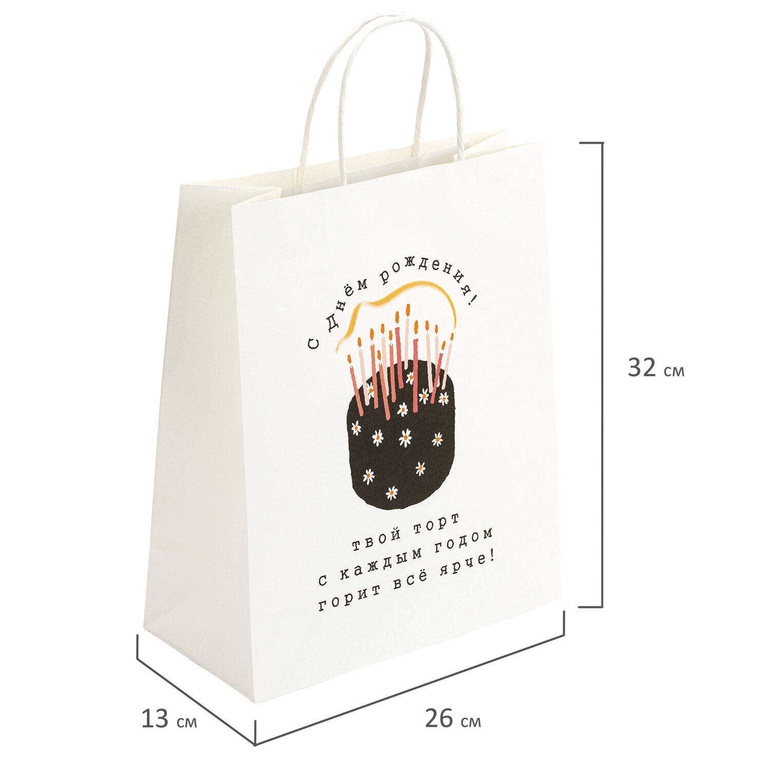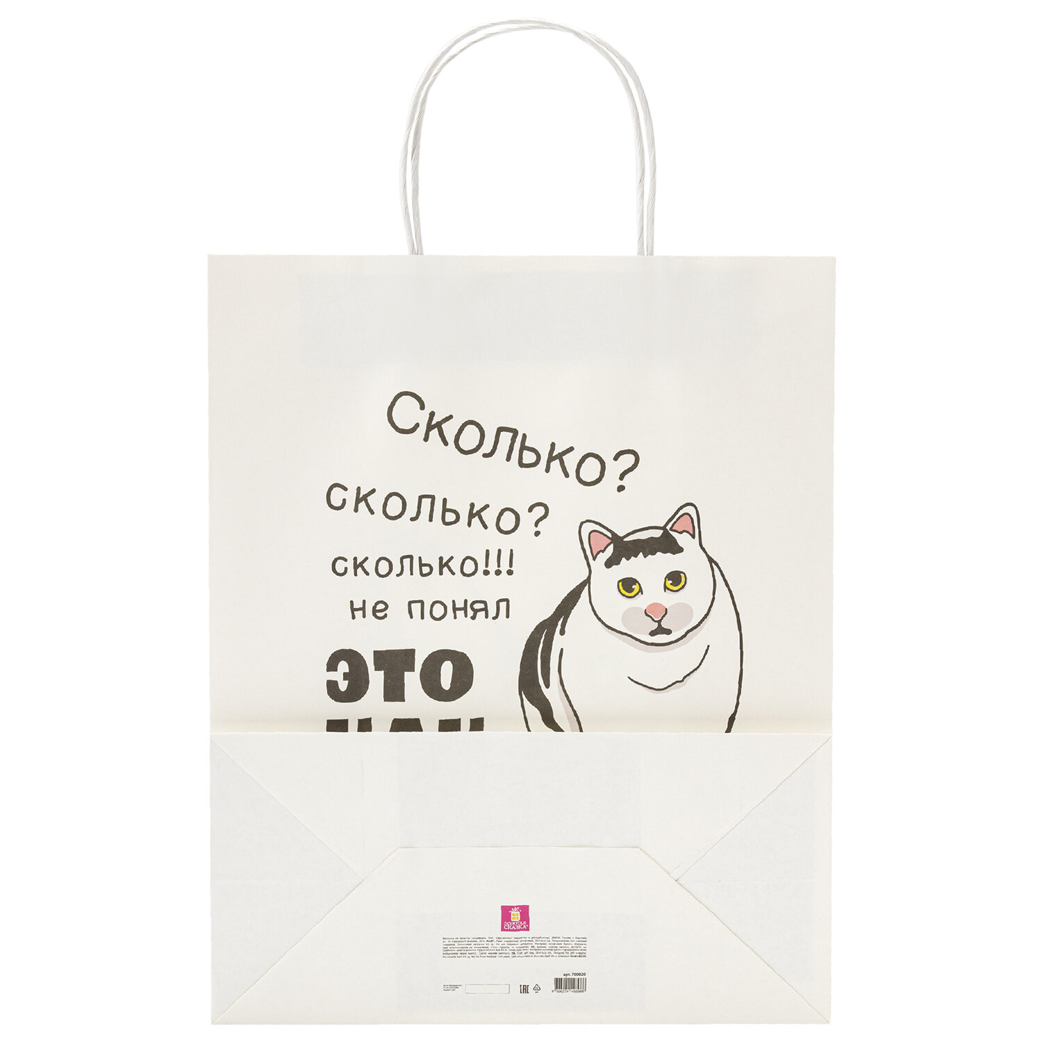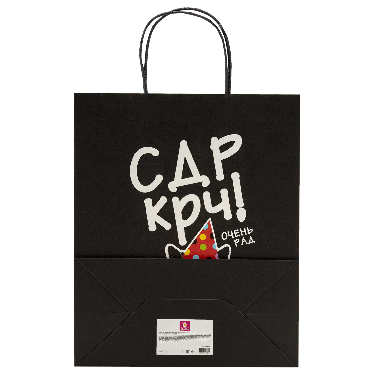 Пакет подарочный (1 штука) 26х13х32 см (L) "Funny Mix", ассорти, крафт, ЗОЛОТАЯ СКАЗКА Код товара: 700820 40,32 ₽ Купить Производитель:ЗОЛОТАЯ СКАЗКА Подарочный пакет "Funny Mix" ЗОЛОТАЯ СКАЗКА – отличное решение для упаковки любого презента, которое позволит с легкостью и со вкусом оформить выбранный подарок. Подарочный пакет из крафтовой бумаги – идеальное решение для вашего праздника! Благодаря плотности 150 г/м2 пакет надежно удерживает свою форму и защищает содержимое, сохраняя ваш подарок в идеальном состоянии. Яркие и оригинальные дизайны (4 варианта ассорти) придадут вашему подарку особый шарм и настроение. Оптимальный размер (26х13х32 см) идеально подходит для различных подарков – от маленького сюрприза до крупного презента. Удобные плетеные ручки обеспечивают комфортное ношение, добавляя элегантности и стиля вашему подарку.Производство: КитайФормат: вертикальныйВид пакета: штучныйДизайн: Funny MixМатериал: крафт-бумагаКоличество в комплекте: 1 шт.С рисунком: даЦвет: черный, белыйРазмер пакета: L (26х13х32) смФормат размера пакета: LВес: 68 грРазмер упаковки: 0.5 × 41.2 × 26 смОбъём: 0.0004 м3Промежуточная упаковка: 12 штТранспортная упаковка: 96 штШтрих-код: 4606224498607 Файлы Сертификат-1.jpg Сертификат-2.jpg Сертификат-3.jpg Сертификат-4.jpg